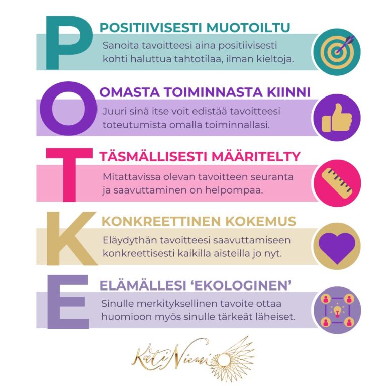Kun olet tarkistanut tavoitteesi asettamisen näillä POTKE-tavoitekriteereillä, niin pyydäthän myös apua tavoitteesi saavuttamiseksi määrätietoisesti ja silti levollisemmin mielin? >> Varaa tapaamisemme täältä.